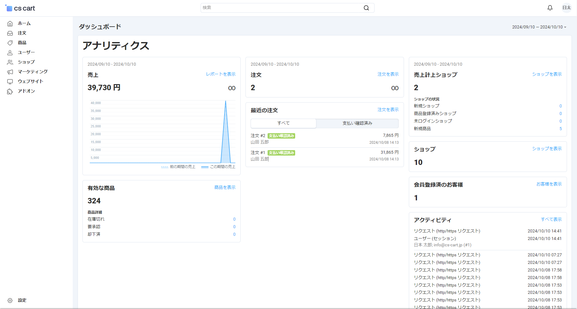 <table><thead><tr><th width="234">項目</th><th>説明</th></tr></thead><tbody><tr><td>売上</td><td>指定期間中の売上金額とグラフ</td></tr><tr><td>注文</td><td>指定期間中の総注文数</td></tr><tr><td>売上計上ショップ</td><td>売上のあったショップ数</td></tr><tr><td>最近の注文</td><td>直近の注文詳細（注文番号、顧客名、金額、日時）の一覧一覧表示されます</td></tr><tr><td>有効な商品</td><td>登録されている商品数とそのステータス</td></tr><tr><td>ショップ</td><td>ECモールに出店中のショップ数</td></tr><tr><td>会員登録済のお客様</td><td>会員登録を完了した顧客数</td></tr><tr><td>アクティビティ</td><td>最近のシステム活動（リクエスト、ユーザーセッションなど）を時系列で表示</td></tr></tbody></table>