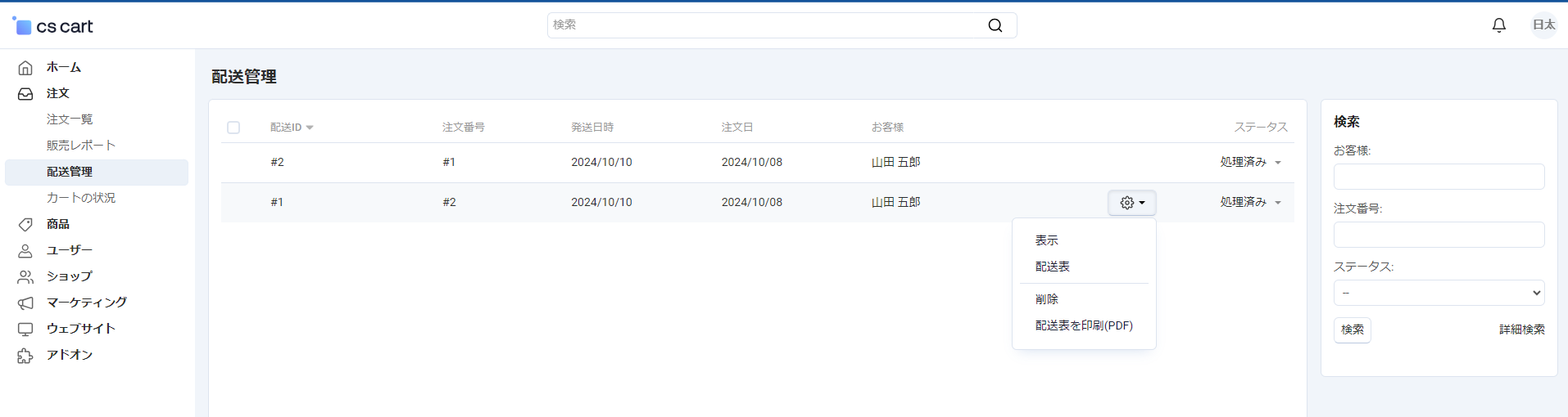 <table><thead><tr><th width="248">項目</th><th>説明</th></tr></thead><tbody><tr><td>配送ID</td><td>配送の識別番号を表示・ソート</td></tr><tr><td>注文番号</td><td>関連する注文番号を表示</td></tr><tr><td>発送日時</td><td>商品の発送日を表示</td></tr><tr><td>注文日</td><td>注文が行われた日付を表示</td></tr><tr><td>お客様</td><td>注文者名を表示</td></tr><tr><td>歯車アイコン</td><td>以下のアクションを実行<br>・表示<br>・配送表<br>・削除<br>・配送表を印刷（PDF）</td></tr><tr><td>ステータス</td><td>配送ステータス（処理済み /  梱包済み / 配送済み）を表示（変更可）</td></tr><tr><td><strong>検索</strong></td><td></td></tr><tr><td>お客様</td><td>お客様名で検索</td></tr><tr><td>注文番号</td><td>注文番号で検索</td></tr><tr><td>ステータス</td><td>配送ステータスで検索</td></tr><tr><td>「検索」ボタン</td><td>検索を実行</td></tr><tr><td>「詳細検索」ボタン</td><td>詳細な検索条件を表示</td></tr></tbody></table>