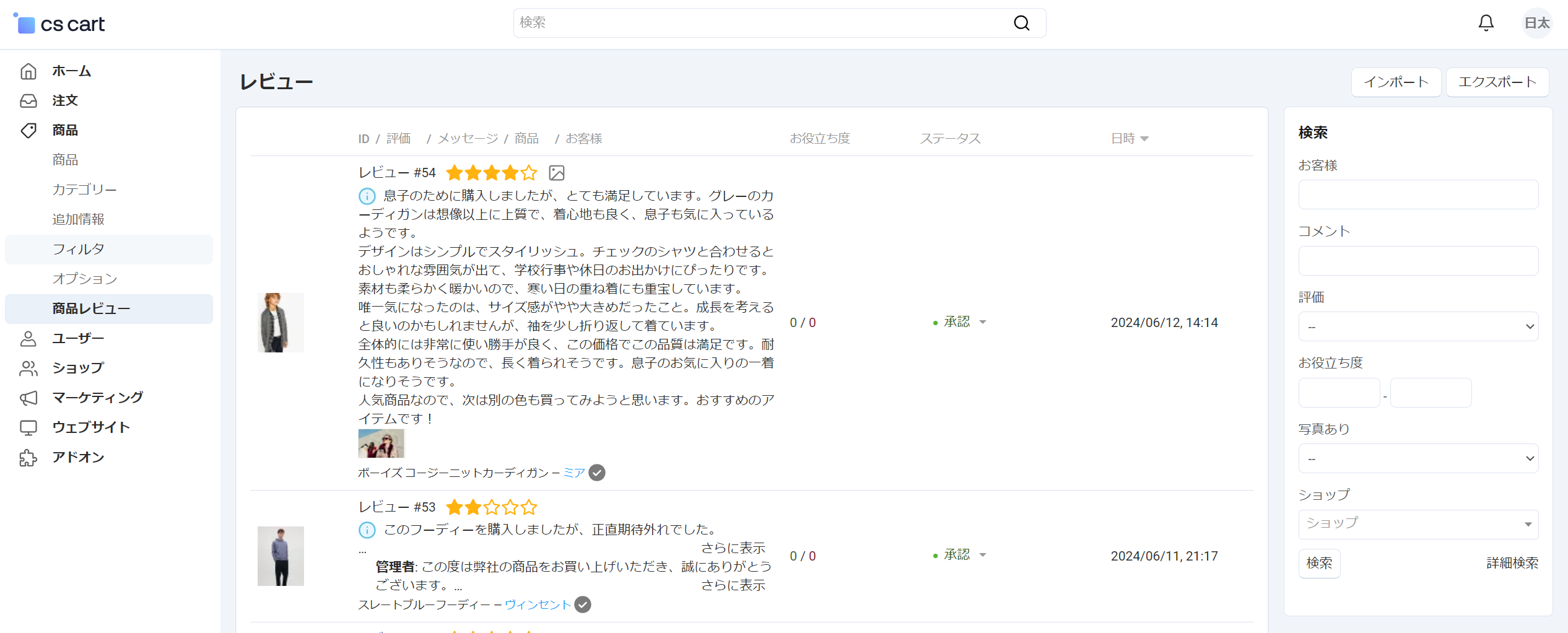 <table><thead><tr><th width="274">項目</th><th>説明</th></tr></thead><tbody><tr><td>「インポート」ボタン</td><td>レビューデータをインポート</td></tr><tr><td>「エクスポート」ボタン</td><td>レビューデータをエクスポート</td></tr><tr><td>商品画像</td><td>レビュー対象商品の画像</td></tr><tr><td>ID / 評価 / メッセージ / 商品 / お客様</td><td>レビューの内容を表示</td></tr><tr><td>お役立ち度</td><td>他のユーザーが判断したレビューの有用性を表示</td></tr><tr><td>ステータス</td><td>レビューのステータス（承認 / 未承認）」を表示</td></tr><tr><td>歯車アイコン</td><td>以下のアクションを実行</td></tr><tr><td>日時</td><td>レビューの投稿日時を表示</td></tr><tr><td><strong>検索</strong></td><td></td></tr><tr><td>お客様</td><td>顧客名でレビューを検索</td></tr><tr><td>コメント</td><td>レビュー内容でレビューを検索</td></tr><tr><td>評価</td><td>星評価でレビューを検索</td></tr><tr><td>お役立ち度</td><td>お役立ち度でレビューを検索</td></tr><tr><td>写真あり</td><td>写真付きレビューで絞り込み</td></tr><tr><td>ショップ</td><td>特定のショップのレビューを検索</td></tr><tr><td>「検索」ボタン</td><td>設定した条件で検索を実行</td></tr><tr><td>「詳細検索」ボタン</td><td>より詳細な検索オプションを表示</td></tr></tbody></table>