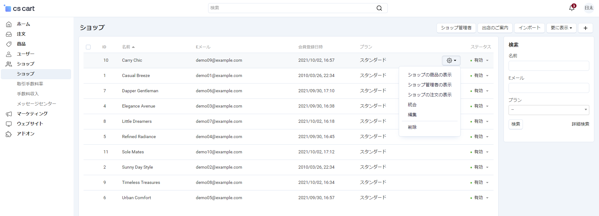 <table><thead><tr><th width="247">項目</th><th>説明</th></tr></thead><tbody><tr><td>「ショップ管理者」ボタン</td><td>ショップ管理者の一覧ページに移動</td></tr><tr><td>「出店のご案内」ボタン</td><td>出店を依頼するメールを送信</td></tr><tr><td>「インポート」ボタン</td><td>ショップデータをインポート</td></tr><tr><td>「更に表示」ボタン</td><td>以下のアクションを実行<br>・エクスポート<br>・出店ご案内中のお客様の表示</td></tr><tr><td>「+」ボタン</td><td>新しいショップを追加</td></tr><tr><td>ID</td><td>ショップの識別番号</td></tr><tr><td>名前</td><td>ショップの名称</td></tr><tr><td>Eメール</td><td>ショップの連絡先メールアドレス</td></tr><tr><td>会員登録日時</td><td>ショップの登録日時</td></tr><tr><td>プラン</td><td>ショップの契約プラン</td></tr><tr><td>歯車アイコン</td><td>以下のアクションを実行<br>・ショップの商品の表示<br>・ショップ管理者の表示<br>・ショップの注文の表示<br>・統合<br>・編集<br>・削除</td></tr><tr><td>ステータス</td><td>ショップのステータス（有効/保留/一時停止/無効）を表示（変更可能）</td></tr><tr><td><strong>検索</strong></td><td></td></tr><tr><td>名前</td><td>ショップ名で検索</td></tr><tr><td>Eメール</td><td>メールアドレスで検索</td></tr><tr><td>プラン</td><td>プランで検索</td></tr><tr><td>「検索」ボタン</td><td>設定した条件で検索を実行</td></tr><tr><td>「詳細検索」ボタン</td><td>より詳細な検索オプションを表示</td></tr></tbody></table>