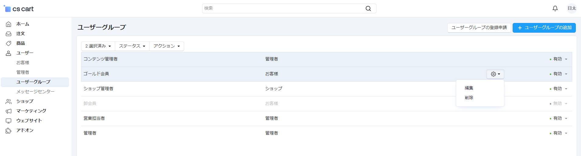 <table><thead><tr><th width="290">項目</th><th>説明</th></tr></thead><tbody><tr><td>「ユーザーグループの登録申請」ボタン</td><td>グループ登録申請一覧ページに移動</td></tr><tr><td>「ユーザーグループの追加」ボタン</td><td>新規ユーザーグループを追加</td></tr><tr><td>ユーザーグループ</td><td>ユーザーグループ名を表示</td></tr><tr><td>タイプ</td><td>グループの種類を表示（管理者/お客様/ショップ管理者）</td></tr><tr><td>歯車アイコン</td><td>以下のアクションを実行</td></tr><tr><td>ステータス</td><td>ユーザーグループのステータス（有効/無効/非表示）を表示（変更可）</td></tr></tbody></table>