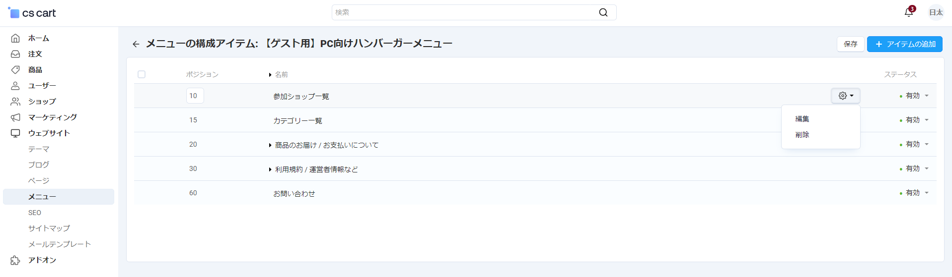 <table><thead><tr><th width="253">項目</th><th>説明</th></tr></thead><tbody><tr><td>メニュー名</td><td>アイテムを登録・編集するメニューの名称</td></tr><tr><td>「←」ボタン</td><td>前のページに戻る</td></tr><tr><td>「保存」ボタン</td><td>変更を保存</td></tr><tr><td>「アイテムの追加」ボタン</td><td>新しいアイテムを追加</td></tr><tr><td>ポジション</td><td>アイテムの表示順序</td></tr><tr><td>名前</td><td>アイテムの名称</td></tr><tr><td>歯車アイコン</td><td>以下のアクションを実行<br>・編集<br>・削除</td></tr><tr><td>ステータス</td><td>アイテムのステータス（有効/無効/非表示）を表示（変更可）</td></tr></tbody></table>