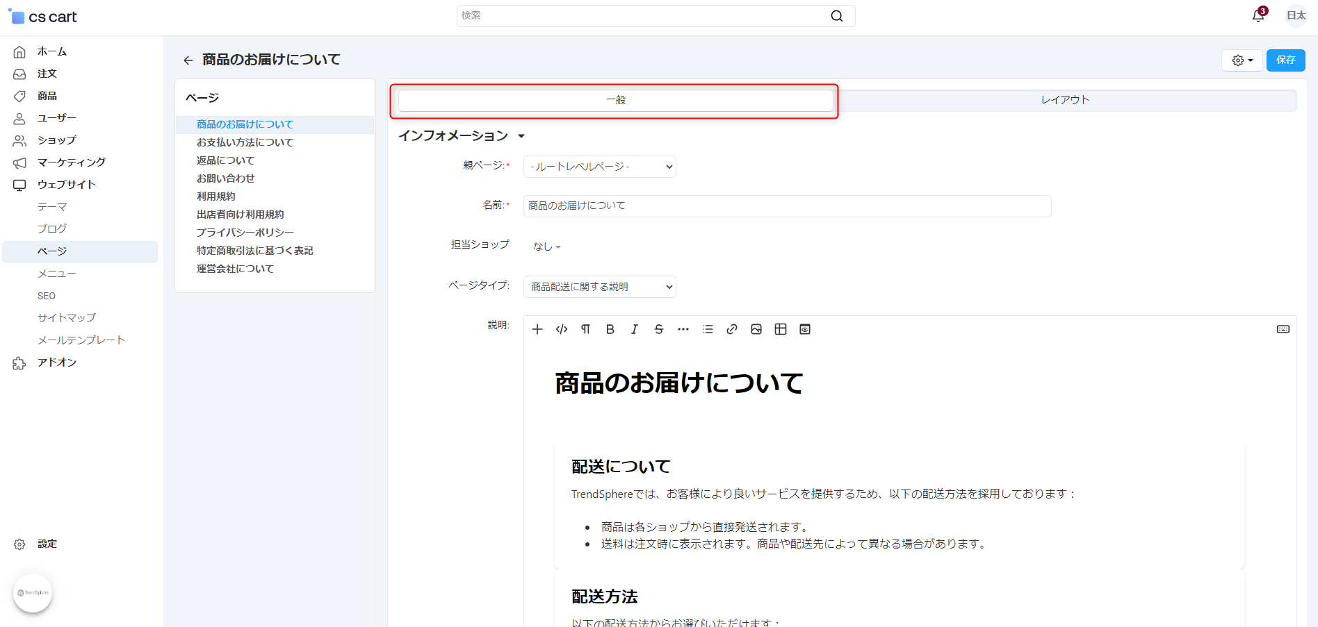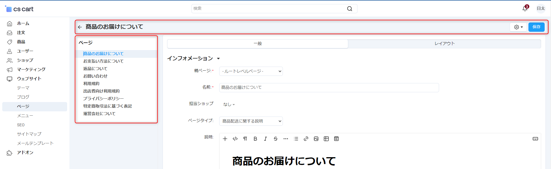 <table><thead><tr><th width="271">項目</th><th>説明</th></tr></thead><tbody><tr><td><strong>インフォメーション</strong></td><td></td></tr><tr><td>親ページ</td><td>ページの親ページを選択</td></tr><tr><td>名前</td><td>ページのタイトルを入力</td></tr><tr><td>担当ショップ</td><td>ページの執筆を担当したショップ名（ECモール管理者が執筆した場合は「なし」）</td></tr><tr><td>説明</td><td>ページの内容を入力</td></tr><tr><td>ステータス</td><td>ページのステータス（有効/非表示/無効）を選択</td></tr><tr><td><strong>SEO / Metaタグ用データ</strong></td><td></td></tr><tr><td>ページタイトル</td><td>SEO用のページタイトルを入力</td></tr><tr><td>METAタグの説明文</td><td>メタディスクリプションを入力</td></tr><tr><td>METAタグのキーワード</td><td>メタキーワードを入力</td></tr><tr><td><strong>表示設定</strong></td><td></td></tr><tr><td>ユーザーグループ</td><td>記事を閲覧できるユーザーグループを選択</td></tr><tr><td>作成年月日</td><td>記事の作成日を設定</td></tr><tr><td>適用期間を設定</td><td>記事の公開期間を設定するオプション</td></tr><tr><td>開始日</td><td>記事の公開開始日を設定</td></tr><tr><td>終了日</td><td>記事の公開終了日を設定</td></tr></tbody></table>